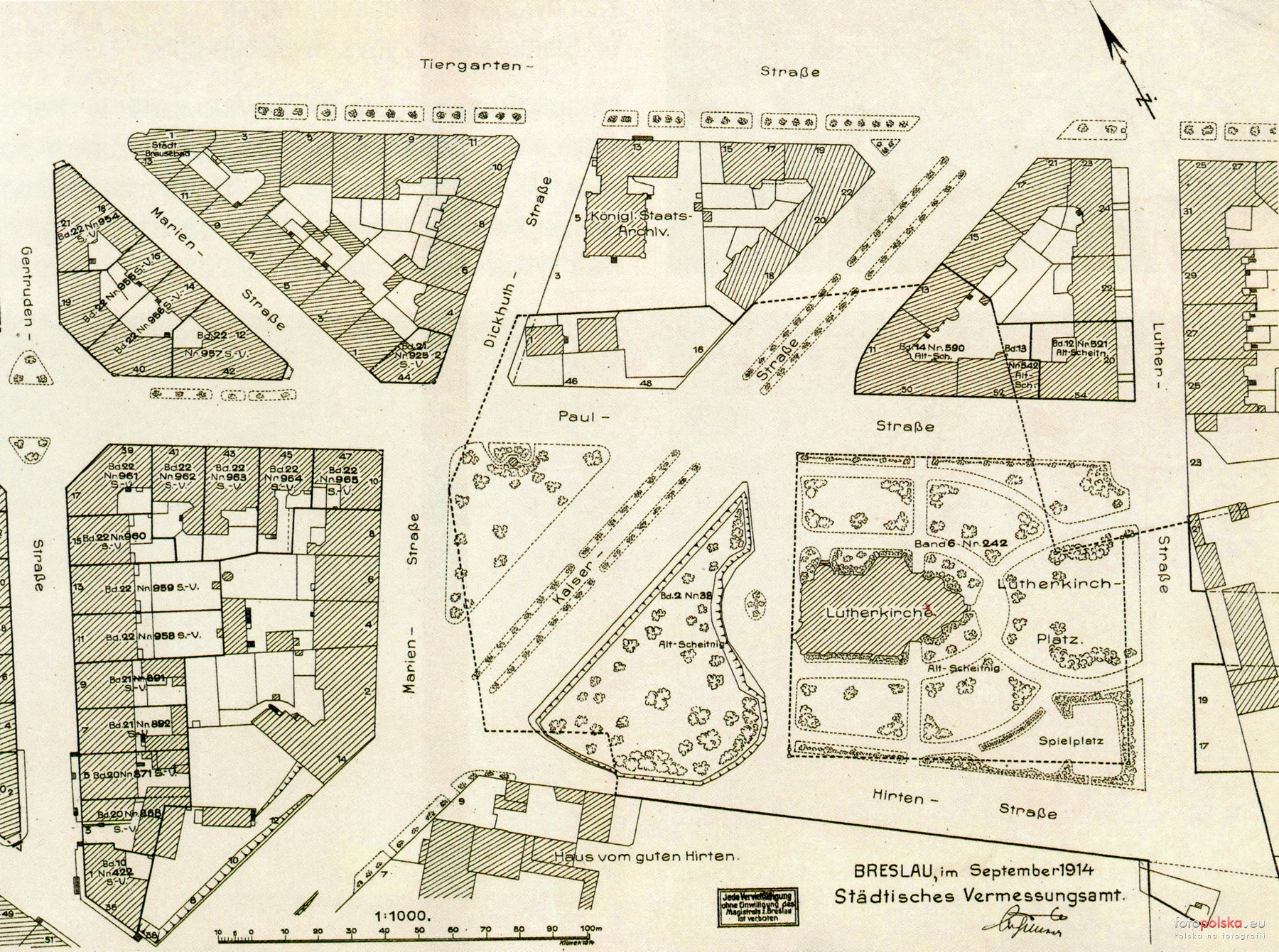 1914 , Skwer przy kościele Lutra i okolica na planie z 1914 roku.Skomentuj zdjęcie