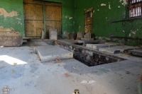 8 listopada 2015 , Wnętrze domu przedpogrzebowego na nieczynnym od 1969 r. cmentarzu żydowskim. Budynek zmienił przeznaczenie i była tu obora a potem warsztat samochodowy. Teraz powoli zostaje zasypywany ziemią z okolicznych budów. Jedyne ślady po grobach na tym cmentarzu to macewy zgromadzone wewnątrz budynku. Czyżby otwór do dawnej chłodni ?