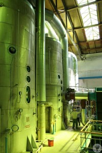 wrzesień 2005 , Pojemnościowe, próżniowe aparaty wyparne. Służą do zagęszczania oczyszczonego soku buraczanego. Hale oświetla naturalne światło poprzez świetliki, w których są żółte szyby filtrujące światło. |