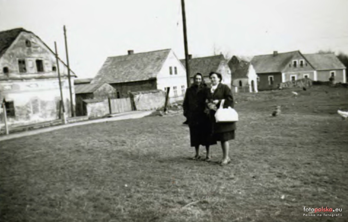 Lata 1945-1950 , Mieszkanki wsi w jej centrum.Skomentuj zdjęcie