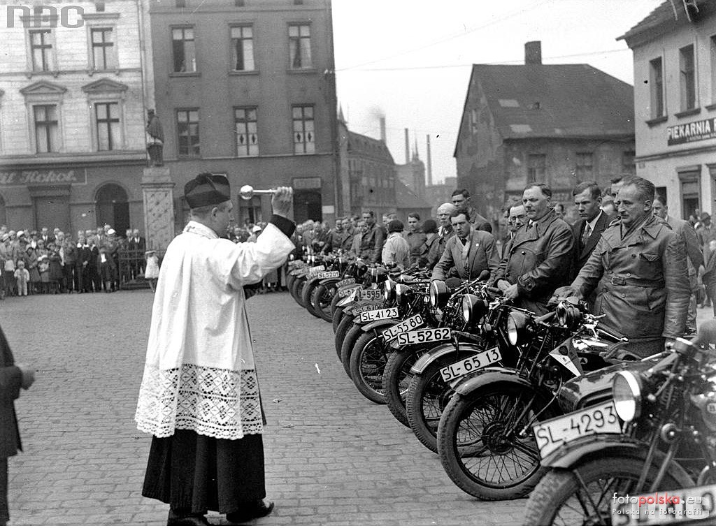 22 kwietnia 1934 , Rynek. Mysłowice - Stare Miasto - Otwarcie sezonu motocyklowego w Mysłowicach . Ksiądz Nowak w trakcie ceremonii poświęcenia. Budynku z kominem już nie ma, widoczna ulica z wysokimi kominami to ul. Przemszy. Budynek z napisem Piekarnia jeszcze istnieje obecnie jest tam Bank. Dwie widoczne kamienice z lewej strony to obecnie Rynek nr 4 i 3. Zgoda reg. NAC 1-S-1419-1Skomentuj zdjęcie |