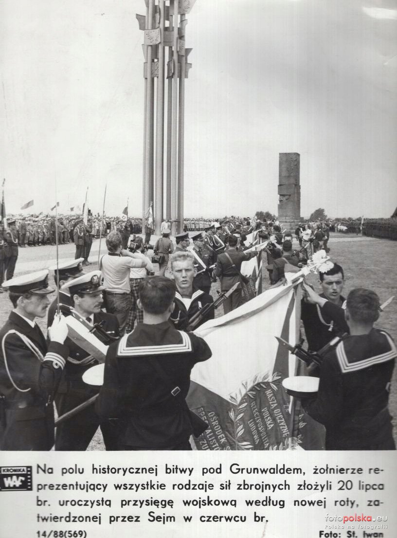 1984 , Na polu historycznej bitwy pod Grunwaldem , żołnierze reprezentujący wszystkie rodzaje sił zbrojnych złożyli 20 lipca br. uroczystą przysięgę wojskową według nowej roty, zatwierdzonej przez Sejm w czerwcu br.Skomentuj zdjęcie