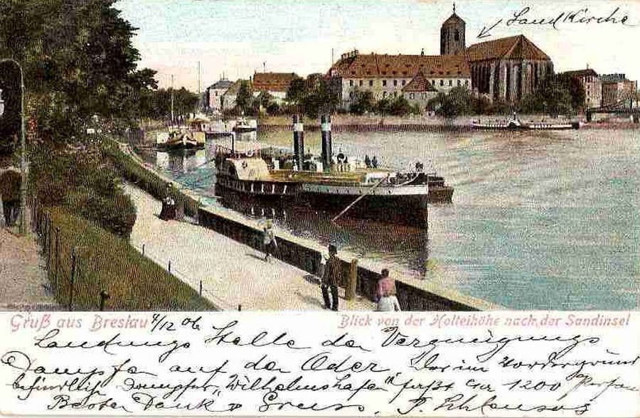 1906 , Przedwojenna widokówka z widokiem na przystań parowców i Wyspę Piasek.Skomentuj zdjęcie |