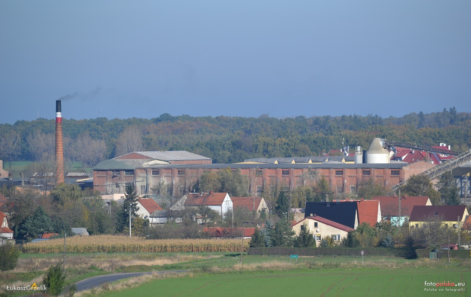 27 października 2014 , Widok z drogi wojewódzkiej nr 374. W centrum kadru wytwórnia podkładów strunobetonowych/dawna cukrownia. |