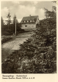 Lata 1930-1935 , Położone na wysokości 1280 m n.p.m. w pobliżu granicy z Polską schronisko Jelenka - dawniej Emma-Quellen-Baude. Schronisko należało do okręgu pocztowego Kowary.Skomentuj zdjęcie |