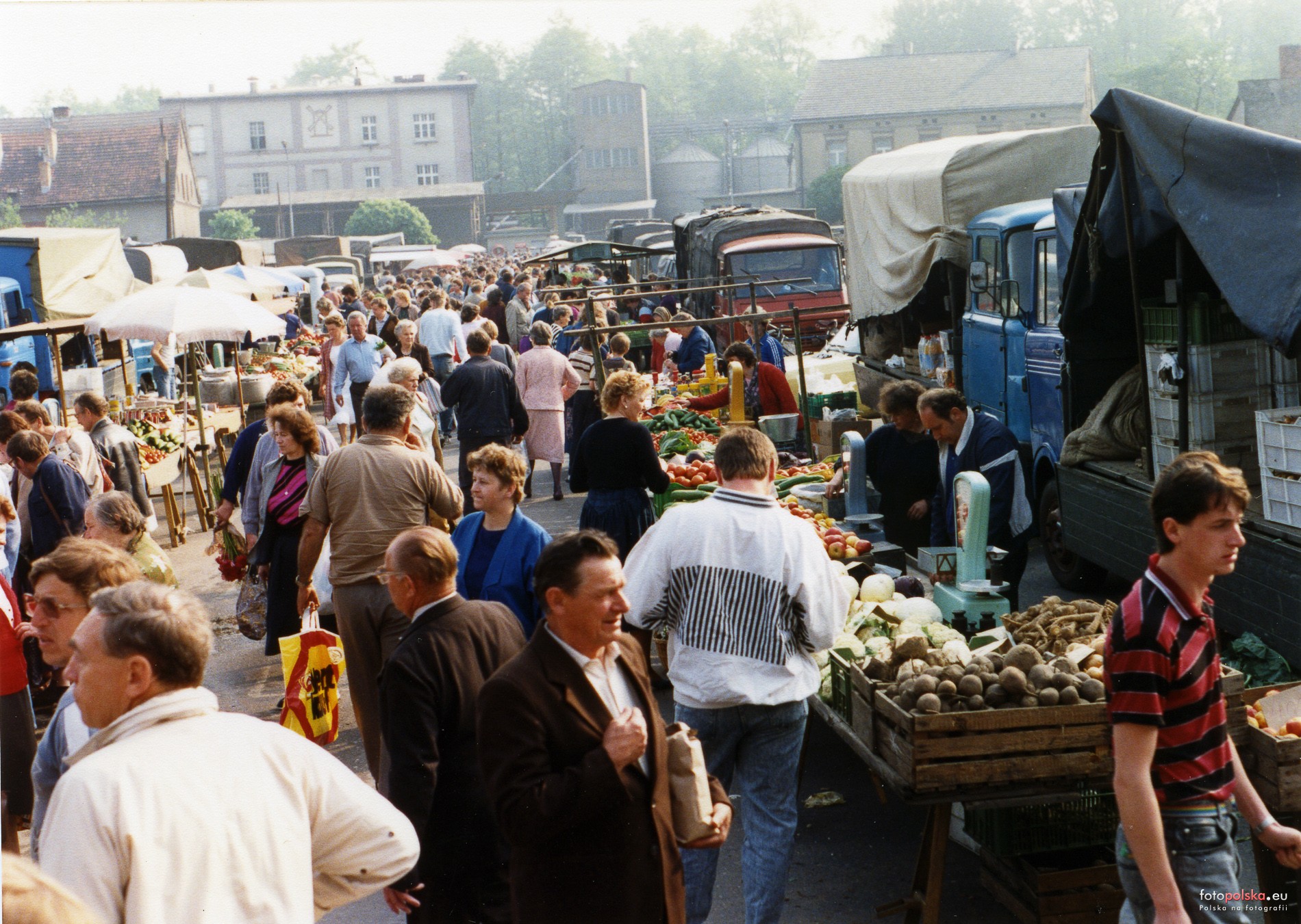 1990 , Plac Targowy w Pszczynie, w okresie gdy odbywały się tam jeszcze targi. Widok targu z miejsca gdzie kiedyś istniał pawilon handlowy "Nasz Dom", w kierunku ulicy Dworcowej. W oddali widoczne zabudowania młyna.Skomentuj zdjęcie