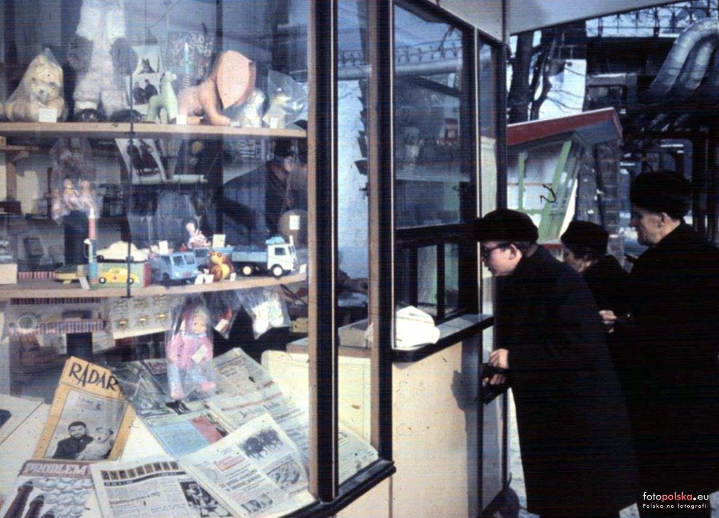 26 stycznia 1970 , Tu zespół dwóch obiektów kiosku Ruchu i nieco dalej kolektury Totka 13-13 widocznego bliżej na Na zdjęciu prawdopodobnie widoczny jest tylko kiosk, ale bez kolektury. Źródło:slajd udostępniony dzięki uprzejmości pana Macieja Wysockiego.Skomentuj zdjęcie