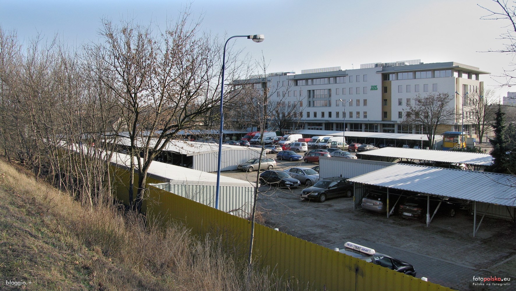 7 lutego 2016 , Wschodnia część terenu pod adresem Aleksandrowska 2/8 należącego do Polskiego Związku Motorowego, na której usytuowany jest parking strzeżony - widok z nasypu wiaduktu na ul. Aleksandrowskiej. W głębi widać nowy biurowiec ZUS przy ul. Lipiec Reymontowskich.