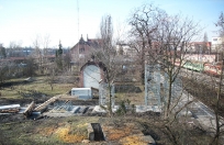 8 marca 2009 , Budowa kładki tymczasowej. Wejście na kładkę od strony południowej, gotowe stalowe elementy konstrukcji, trwa montaż drewnianych schodów. Za kładką widoczny charakterystyczny budynek. U dołu północne wejście do schronu przeciwlotniczego.Skomentuj zdjęcie