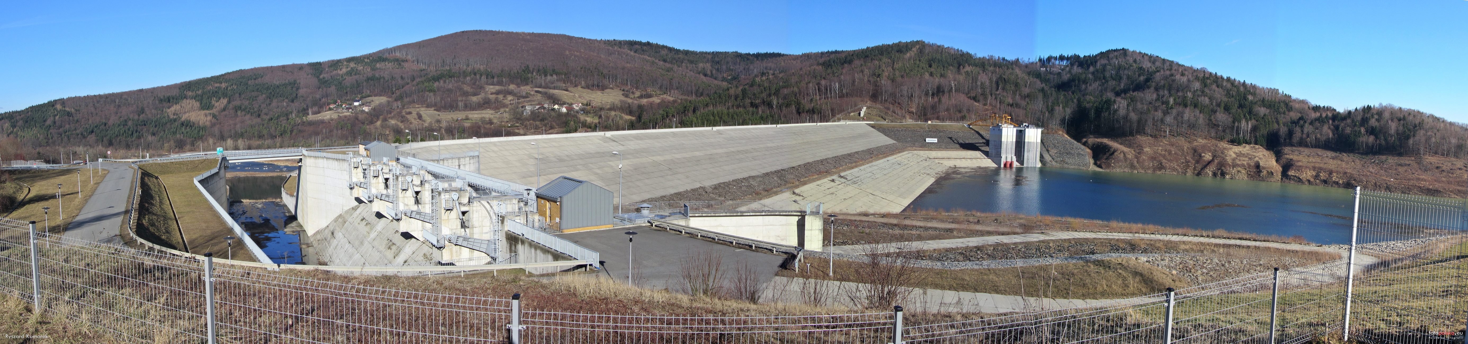 14 lutego 2016 , Zapora w Świnnej Porębie w całej swojej krasie. Panorama sklejona z kilku zdjęć robionych ze statywu. Nie jest doskonała, co wprawne oko zaraz wychwyci. Proszę o zrozumienie. Przymierzałem się do tego kilka razy myślę, że ta panorama jest do przyjęcia. Spróbuję ją pokrótce opisać. Po lewej stronie jest, niewidoczny tutaj wjazd na zaporę, ale widać drogę, która prowadzi do śluz przelewu powierzchniowego. Dobrze widoczne są same śluzy i budynki, w których znajduje się sterownia śluz. Między drogą dojazdową i śluzami znajduje się kanał przelewowy. Za mostkiem nad nim wjeżdża się na główną koronę zapory. Ma ona 640 m długości i 54 m wysokości. Przy drugim końcu zapory znajdują się wieże ze śluzami przelewu wewnętrznego. Woda przepływa dwoma sztolniami: lewa wieża prowadzi do sztolni spustowej a prawa do sztolni energetycznej, na której końcu znajduje się elektrownia, która będzie produkować rocznie 14,8 GWh energii elektrycznej.Skomentuj zdjęcie |