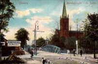 Lata 1905-1910 , Ulica Dworcowa - most nad Kłodnicą i dawny kościół ewangelicki (dziś Kościół św. Barbary).