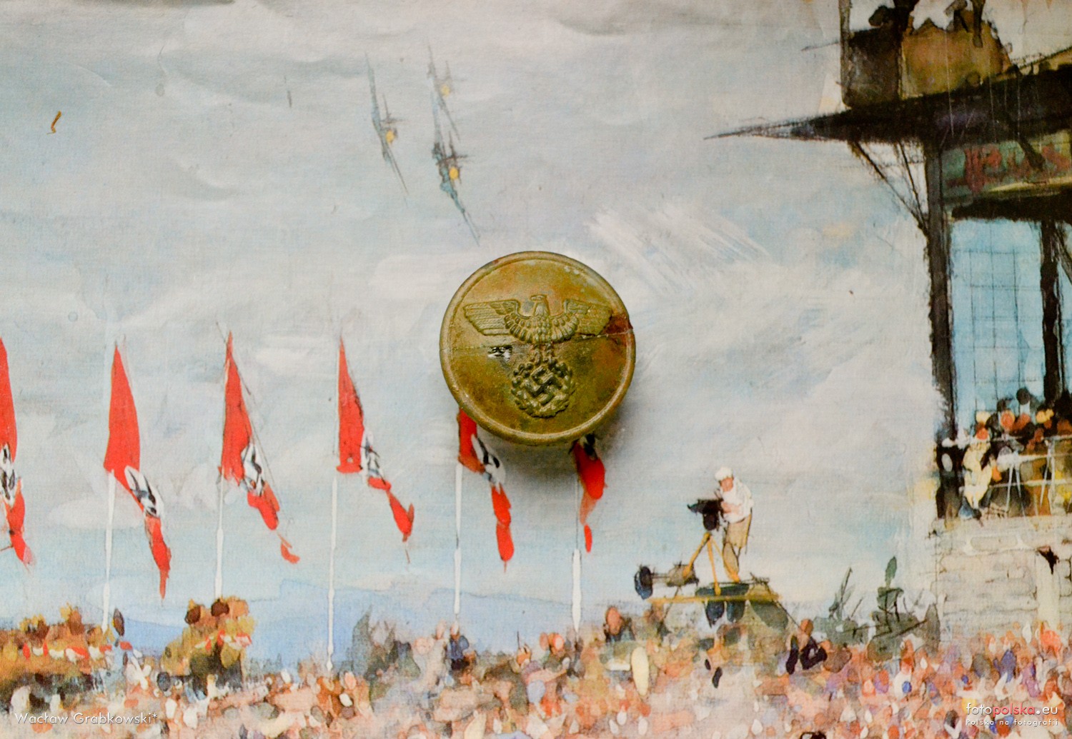 Lata 1933-1935 , Szklany guzik z munduru kolejarza z lat 30. (znaleziony w rzece Oławie przy Kładce Siedleckiej) na tle obrazu nieznanego malarza z 1938 r. - (Neue Kronen Zeitung 1980). |