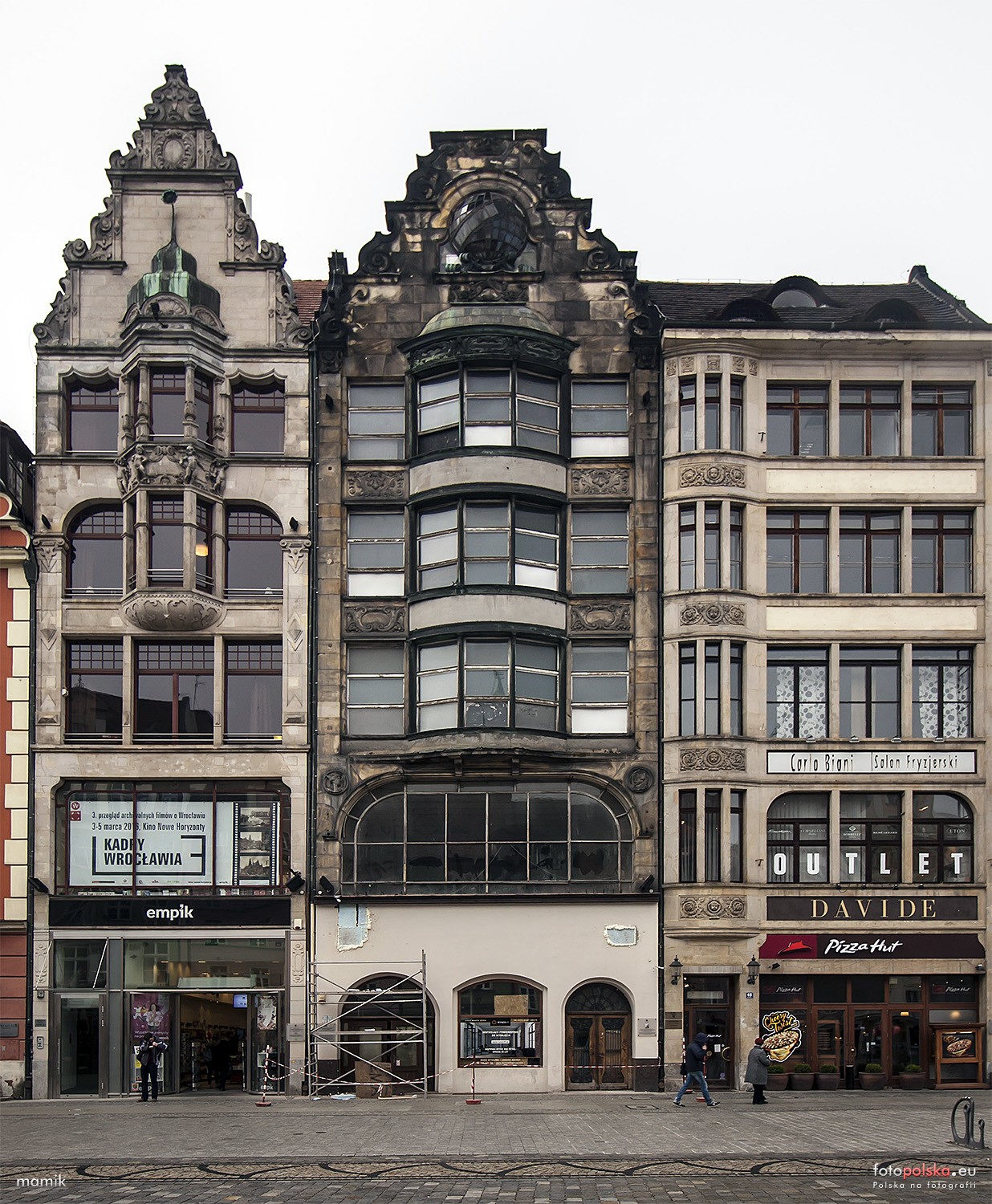 5 pobrań 1400 odsłon 5.96 średnia ocen Poprzednie i następne zdjęcia mamik Obiekty widoczne na zdjęciu Kamienica "Pod Głową św. Jana" więcej zdjęć (27) Zbudowano: 1908 Dawniej: Dom Handlowy "Der Große Bazar" Północna strona rynku - "Targ Łakoci" więcej zdjęć (383) Dawniej: Naschmarkte Seite Strona północna Po północnej stronie (numery 42 do 60), dawniej określanej jako Strona Targu Łakoci (Naschmarkt-Seite), znajdują się m.in. trzy domy towarowe zbudowane według projektów biura Schlesinger i Benedict[5] w pierwszej dekadzie XX w. pod numerami 48, 49 i 50. Również tutaj duża część kamienic to powojenne swobodne rekonstrukcje. W kamienicy Pod Złotą Kotwicą (pod numerem 52) zachowała się we wnętrzu renesansowa kolumna, zaś dom pod numerem 46 jest oryginalnym zabytkiem barokowym. Rynek 42 Apteka Pod Podwójnym Złotym Orłem Rynek 43 Kamienica Pod Złotym Pelikanem Rynek 44 Kamienica Pod Złotym Jeleniem do XVII w. zwana Apteką Targu Łakoci Rynek 45 Rynek 46 Rynek 47 Szwedzka Sień Rynek 48 Kamienica Pod Głową św. Jana nazywana tak od rozebranej w poł. XIX w. wcześniejszej kamienicy. Obecnie znajduje się tu wczesnomodernistyczny dom towarowy z 1908 r. Rynek 49 Rynek 50 Rynek 51 Kamienica Pod Złotym Półksiężycem Rynek 52 Kamienica Pod Złotą Kotwicą Rynek 53 Rynek 54 Kamienica Pod Morwą Rynek 55 Rynek 56 Rynek 57 Rynek 58 Kamienica Pod Złotą Palmą neorenesansowy dom towarowy z pocz. XX w. na miejscu dwóch wcześniejszych kamienic. Rynek 60 Źródło: Rynek 49 więcej zdjęć (44) Zbudowano: 1903 Dawniej: Dom Handlowy Trautner Rynek 50 więcej zdjęć (34) Zbudowano: 1904 Dawniej: Dom Handlowy Hünert, EMPiK Megastore) Rynek więcej zdjęć (6101) Dawniej: Ring Rynek we Wrocławiu (niem. Großer Ring in Breslau) – średniowieczny plac targowy we Wrocławiu, obecnie centralna część strefy pieszej. Stanowi prostokąt o wymiarach 205 na 175 m[1]. Jest to jeden z największych rynków staromiejskich Europy. Zabudowę otaczającą Rynek stanowią budynki pochodzące z różnych epok historycznych. Centralną część Rynku zajmuje blok śródrynkowy, składający się z Ratusza, Nowego Ratusza oraz licznych kamienic. Rynek tworzy układ urbanistyczny wraz z przekątniowo przyległymi placem Solnym oraz placem wokół kościoła św. Elżbiety. Do Rynku prowadzi 11 ulic – po dwie w każdym narożniku (Świdnicka, Oławska, E. Gepperta (Zamkowa), Ruska, św. Mikołaja, Odrzańska, Kuźnicza, Wita Stwosza), ponadto przebity w XIV lub XV w. Kurzy Targ po stronie wschodniej oraz wąskie ul. Więzienna i Przejście św. Doroty. Rynek powstał w związku z lokacją Wrocławia, wedle nowszych badań już za czasów Henryka Brodatego, między 1214 a 1232. Starsze publikacje twierdziły, że powstał dopiero w czasie powtórnej lokacji w 1241-1242. Z biegiem czasu wokół Rynku powstały kamienice patrycjatu, a około połowy XIV wieku utworzyły ciągłe pierzeje i nastąpiło utrwalenie podziałów własnościowych. W XIX w. przez Rynek poprowadzono linie tramwaju, najpierw konnego, a później także elektrycznego. Tramwaje kursowały przez Rynek do połowy lat 70. zeszłego stulecia, gdy przeniesiono je na Trasę W-Z. W latach 1996-2000 wyremontowano nawierzchnię Rynku, ostatecznie zamykając ruch samochodowy po jego wschodniej stronie, jak również odnowiono większość elewacji. Przy Rynku znajduje się obecnie 60 numerowanych posesji, przy czym niektóre budynki posiadają kilka numerów. Podziały działek przebiegają najczęściej inaczej niż dawne podziały lokacyjne, na skutek wtórnych podziałów i scaleń. Każda działka posiada również swoją historyczną nazwę, zwykle związaną z atrybutem umieszczonym niegdyś na elewacji kamienicy lub losami miejsca, np. Pod Gryfami, Pod Błękitnym Słońcem, Stary Ratusz. Źródło: |
