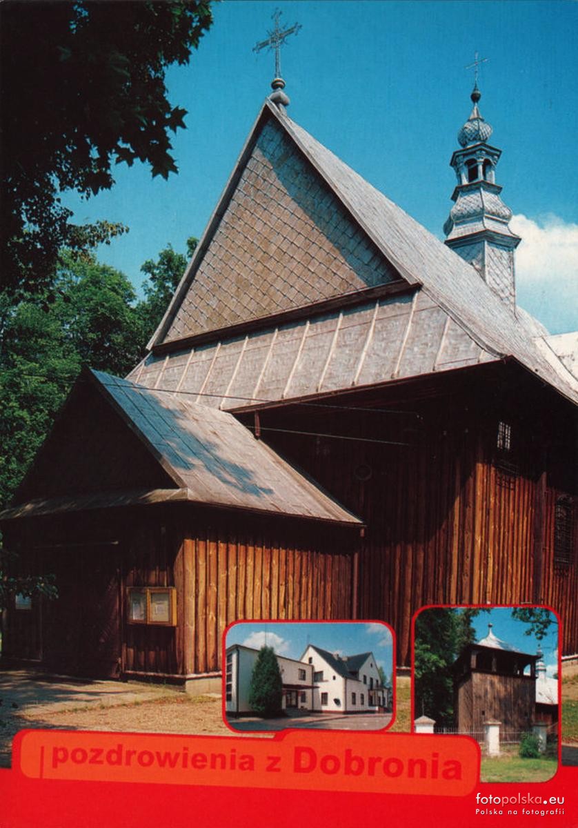 Lata 1990-2000 , Dobroń. Drewniany kościół, dzwonnica i (chyba) Urząd GminySkomentuj zdjęcie |