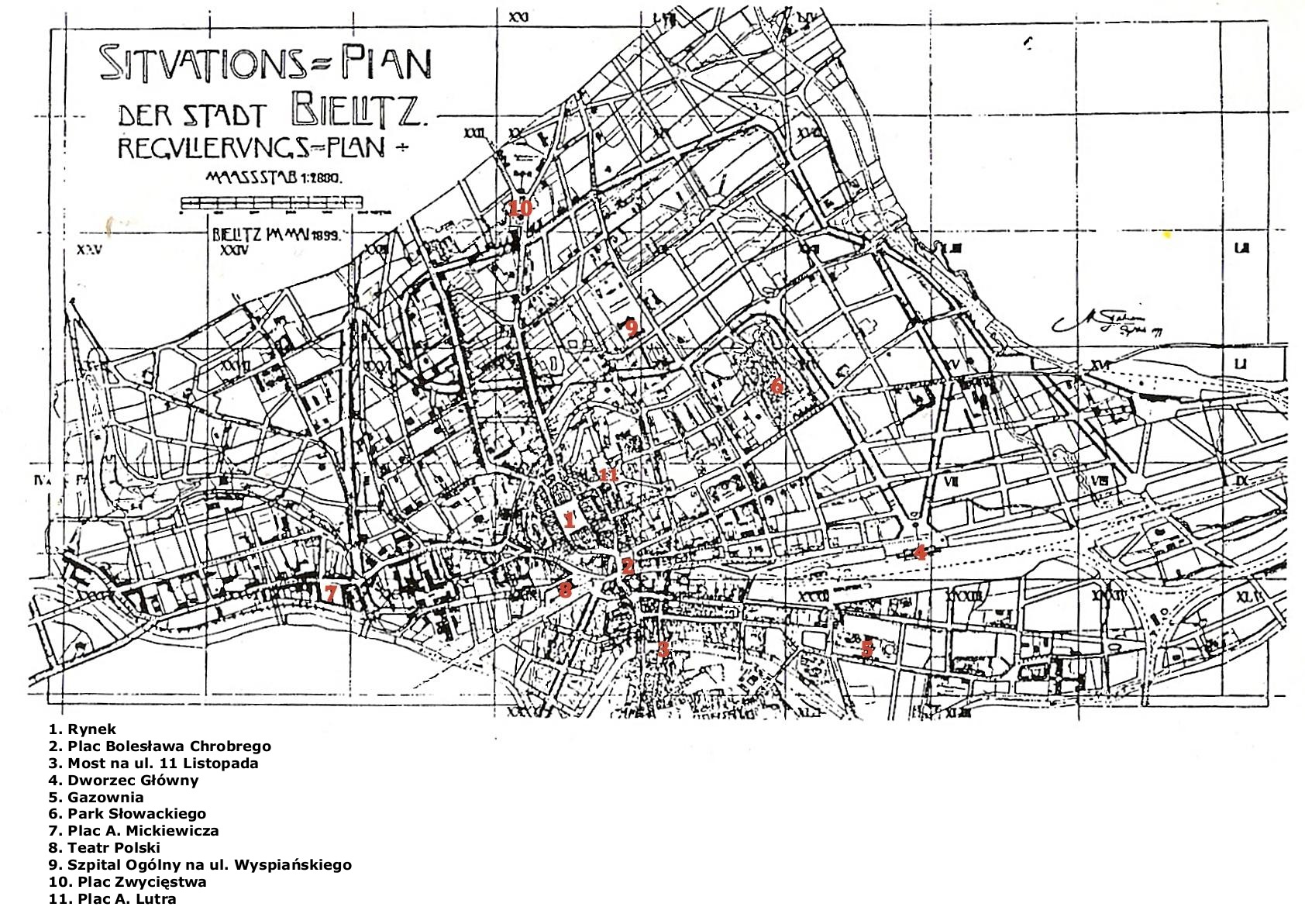 1899 , Plan regulacyjny Bielska opracowany w latach 1898-1899 przez słoweńskiego urbanistę Maxa Fabianiego z naniesionymi dla orientacji współczesnymi oznaczeniami kilku miejsc. Mapa pochodzi z 'Erläuterungs-Berichtzum General-Regulirungs-Plane der Stadt Bielitz'.Skomentuj zdjęcie |