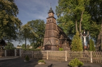6 pobrań 1157 odsłon 6 średnia ocen Poprzednie i następne zdjęcia s_mile Obiekty widoczne na zdjęciu Kościół św. Wawrzyńca więcej zdjęć (19) Zbudowano: 1706 Zabytek: 86/54 z 17.02.1954; 187/78 Kościół w Wachowie wzmiankowany w 1679 r., obecny zbudowany w 1706, odnowiony w 1907 r. Orientowany, drewniany, konstrukcji zrębowej z wieżą konstrukcji słupowej. Prezbiterium zamknięte trójbocznie, przy nim od pn. zakrystia z lożą na piętrze. Szersza nawa prostokątna z kruchtą od pd. i wieżą od zach. Prezbiterium nakryte pozornym sklepieniem kolebkowym z płaskimi odcinkami stropowymi. W nawie nowszy strop płaski z dwoma podciągami wspartymi na dwóch parach słupów. Chór muzyczny wsparty na dwóch parach słupów. Okna zamknięte segmentowo. Loża otwarta do prezbiterium wydłużonym prostokątnym otworem. Wejście od zach. do nawy zamknięte segmentowo. Na zewnątrz kościół otoczony sobotami, wspartymi na słupach, obitymi gontem. Dachy siodłowe kryte gontem. Nad zakrystią i lożą odrębny dach czterospadowy. Wieża o ścianach wydatnie zwężających się ku górze, z półkolistym okapem gontowym nad wejściem. Górna kondygnacja wieży węższa, wydzielona zadaszeniem, o ścianach pionowych, nakryta baniastym hełmem gontowym. Opis na podstawie: Katalog zabytków sztuki w Polsce, tom VII województwo opolskie, zeszyt 10 powiat oleski |