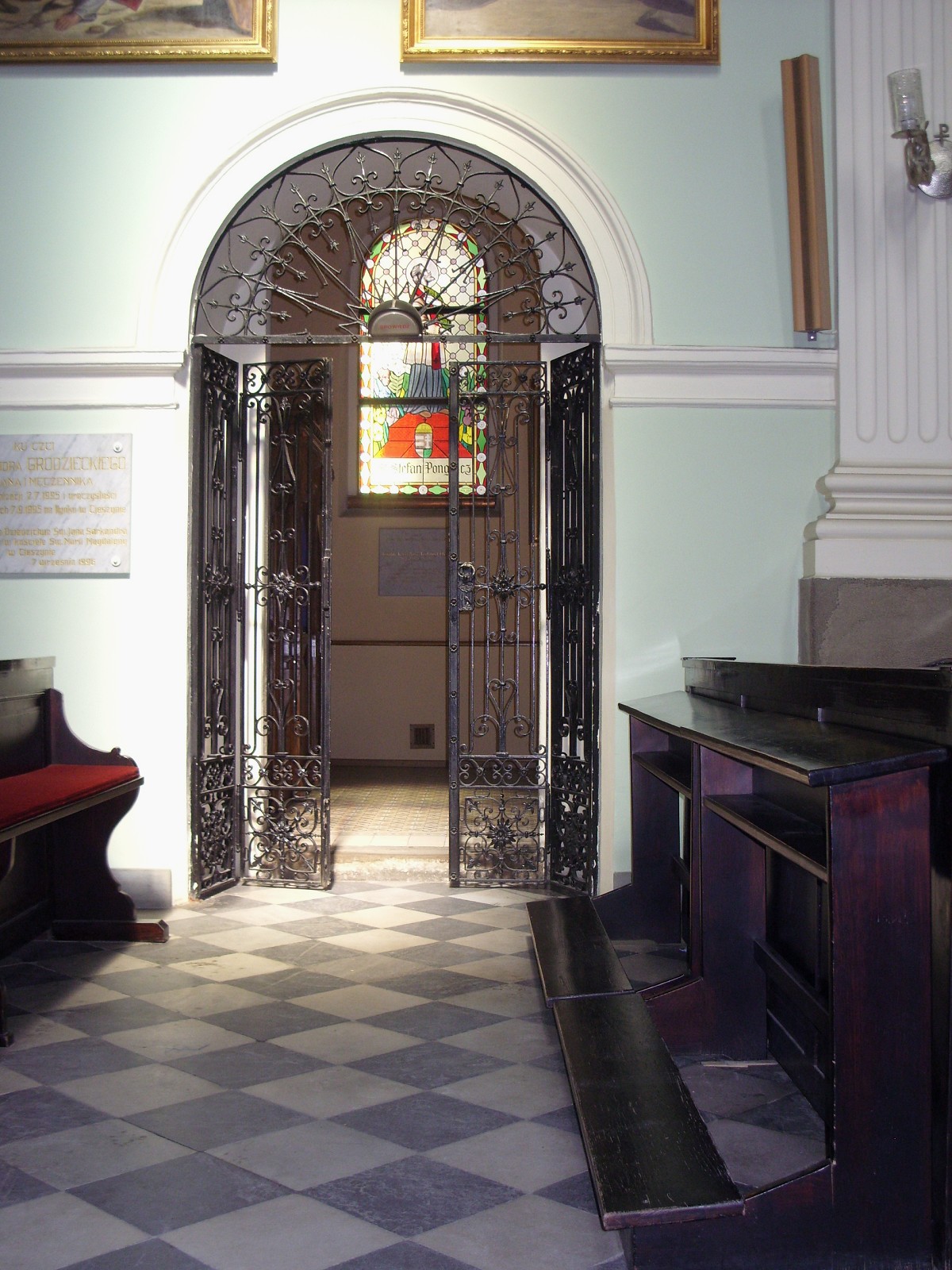 27 marca 2016 , Wejście do kaplicy św. Melchiora Grodzieckiego zamyka kunsztownie wykonana kuta bramka. Podobnie zamykane są inne kaplice i wejście do nawy kościoła. Na kilku kratach znajdują się tabliczki z nazwiskiem Kopietz. Adolf Kopietz posiadał warsztat na ul. Trzech Braci. Warsztat oferował m.in. : oszczędne piece własnej produkcji, ogrodzenia grobów, wiatrowskazy, zamki.Skomentuj zdjęcie |
