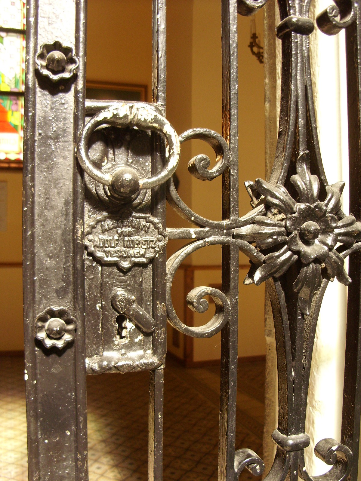 27 marca 2016 , Wejście do kaplicy św. Melchiora Grodzieckiego zamyka kunsztownie wykonana kuta bramka. Podobnie zamykane są inne kaplice i wejście do nawy kościoła. Na kilku kratach znajdują się tabliczki z nazwiskiem Kopietz. Adolf Kopietz posiadał warsztat na ul. Trzech Braci. Warsztat oferował m.in. : oszczędne piece własnej produkcji, ogrodzenia grobów, wiatrowskazy, zamki.Skomentuj zdjęcie