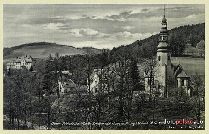 Lata 1930-1938 , Po prawej kościół parafialny z 1852 roku. Duży gmach po lewej stronie to dom wypoczynkowy wybudowany w 1909 r. przez siostry Urszulanki. Mieścił on również szkołę gospodarstwa domowego z internatem. Od 1948 r. - Państwowy Dom Dziecka.Skomentuj zdjęcie |