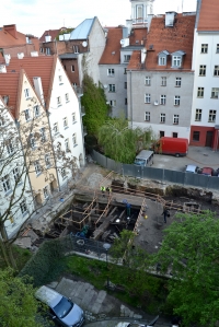 28 kwietnia 2016 , Trwają prace archeologiczne przy Jodłowej we Wrocławiu. W tej części działki odkryto fragmenty drewnianych zabudowań, a także konstrukcję murowaną z cegieł. Widok z kamienicy Nożownicza 48. |