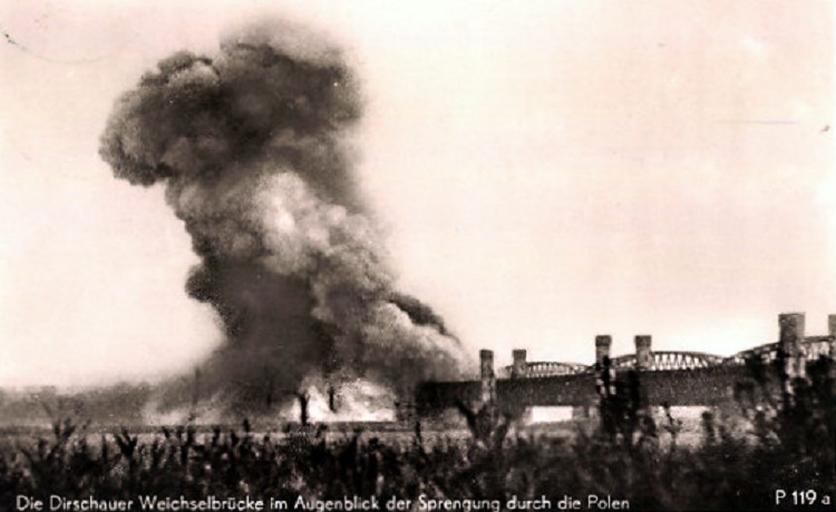 Latem 1939 r., w obliczu zagrożenia ataku ze strony Niemiec, oba mosty w Tczewie zostały zaminowane przez polskich saperów dowodzonych przez por. Norberta Juchtmana. 1 września mosty zostały poważnie zniszczone. W moście drogowym wysadzenie filaru na terenie zalewowym (w miejscu dawnego przyczółka od strony Lisewa) spowodowało opadnięcie szóstego, niegdyś skrajnego, przęsła z 1857 roku. Przęsło to uległo złamaniu i przy piątym filarze pozostał jedynie krótki, kilkunastometrowy odcinek konstrukcji z 1912 roku. Jeszcze większe zniszczenia powstały w efekcie wysadzenia filarów od strony Tczewa. Zniszczone zostały bowiem oba przęsła nurtowe (czyli pierwsze i drugie licząc od lewego brzegu).
