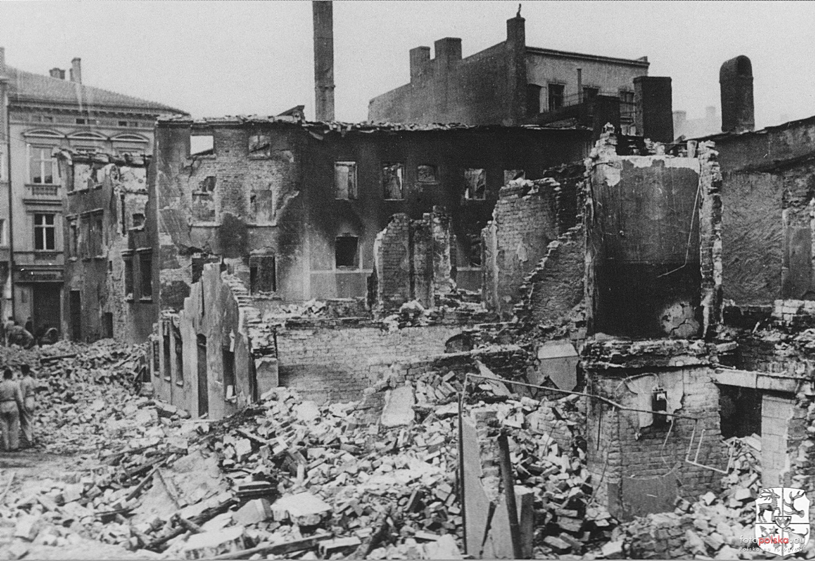 1944 , Ulica Bolesława Chrobrego, zniszczona w czasie alianckiego nalotu 11 kwietnia 1944 roku. Zachowała się kamienica przy lewej krawędzi zdjęcia. |