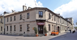 2 pobrania 527 odsłon 5.8 średnia ocen Poprzednie i następne zdjęcia Wincenty Miros Obiekty widoczne na zdjęciu Bazyliańska 5 więcej zdjęć (5) Zbudowano: 1868 Zabytek: A/377 16-12-1986 Kamienica wzniesiona około 1868 r. Kamienica usytuowana w kwartale budowlanym ograniczonym ulicami: Bazyliańską, Pereca, Zamenhofa, Łukasińskiego; w części Zamościa zajmowanej historycznie przez mieszczan pochodzenia żydowskiego. Narożna, oznaczona numerami: Bazyliańska 5, Pereca 14. Brama od ulicy Pereca. Komunikacja na poziomie parteru z bramy i w ściętym narożu. Od strony dziedzińca przybudówka. Fundamenty, ściany zewnętrzne i wewnętrzne, sklepienia i schody piwnicy wzniesione z cegły palonej pełnej łączonej zaprawą piaskowo-wapienną. Ściany obustronnie tynkowane. Stropy żelazno-betonowe (współczesne), płaskie. Wnętrza piwnic przesklepione sklepieniami kolebkowymi ze ślepymi lunetami. Więźba dachowa drewniana, krokwie wsparte na murłacie, usztywnione mieczowanym stolcem prostym. Dach kryty żelazną ocynkowaną blachą. W piwnicy betonowa posadzka, na parterze z betonowych płytek, na piętrze ułożony w jodełkę parkiet. Schody międzykondygnacyjne ze zbrojonego betonu, lastrykowe, poręcza metalowe. Drzwi drewniane, dwuskrzydłowe, płycinowe, wzmocnione stalowym okuciem. Stolarka okienna drewniana. W otworach okiennych na parterze i piętrze krata ze stalowych gładkich prętów. Ścianki działowe zaplecza restauracyjnego drewniane. Galeryjka komunikacyjna ze zbrojonego betonu, nasunięty daszek wsparty na drewnianych słupach. Przybudówka murowana, pokryta żelazną, ocynkowaną blachą. Fundamenty kamienicy założone na planie litery L, ze zredukowaną podstawą. Elewacja główna /dłuższe ramię/ w pierzei ulicy Bazyliańskiej, dwutraktowe, trakt frontowy szerszy amfiladowy, połączony z parterem kamienicy nr 3. Ramię krótsze- elewacja boczna- w pierzei ulicy Pereca, w przyziemiu przejazd, na piętrze dwa trakty wnętrz biurowych; od strony dziedzińca, na poziomie drugiej kondygnacji, galeryjka komunikacyjna. Naroże ścięte, mieszczące główny otwór komunikacyjny. Od strony dziedzińca przybudówka, zblokowana również z kamienicą nr 3, prostokątna. Bryła dwuczłonowa, dwukondygnacyjna, podpiwniczona. Obydwa człony przykryte niskimi dwuspadowymi dachami. Za ul. Bazyliańska więcej zdjęć (350) Dawniej: Wasilkowska Ulica Bazyliańska - zamojska ulica jednojezdniowa na Starym Mieście, jednocześnie najdłuższa wśród ulic staromiejskich. Dawniej ulica ta była krótsza, a ograniczał ją klasztor Bazylianów od południa oraz obecna ul. L. Zamenhofa od północy. W 1591 roku przecznica nie posiadała nazwy, a obecna pojawiła się w 2. połowie XVIII wieku. Na przełomie XIX i XX wieku nazywana była ul. Wasilkowską (z ros. Wasil - Bazyli). Nazwa pochodzi od klasztoru, który stał na południu przed ulicą. Ulica biegnie we wschodniej części Starego Miasta. Od północy łączy się z jednym z większych placów w mieście (plac M. Stefanidesa), zaś przy jej południowym krańcu znajduje się kazamata (fragment dawnej twierdzy). Położone są przy niej takie obiekty jak synagoga (dawniej mieściła się tu biblioteka publiczna), targowisko (tzw. \"Zielony Rynek\"), kamienica \"Dom Centralny\", kościół św. Mikołaja oraz wiele innych zabytków. Za wiki |