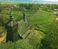 Drewniany, gotycki kościół o konstrukcji zrębowej, zbudowany pod koniec XIV w. Rozbudowany w 1624 r., kiedy to powstała wieża i wieżyczka na sygnaturkę, soboty, koliste otwory okienne w nawie i ziemny wał obronny. W latach 1784 – 1788 powiększono zakrystię i dobudowano nowe soboty. We wnętrzu unikalna polichromia figuralna z 1494 r. oraz późniejsza z ok. 1864 r.