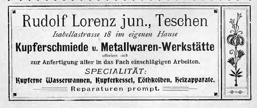 1902 , Reklama z Książki Adresowej Cieszyna przedstawia usługi kuźnicze Rudolfa Lorenza juniora.Skomentuj zdjęcie |