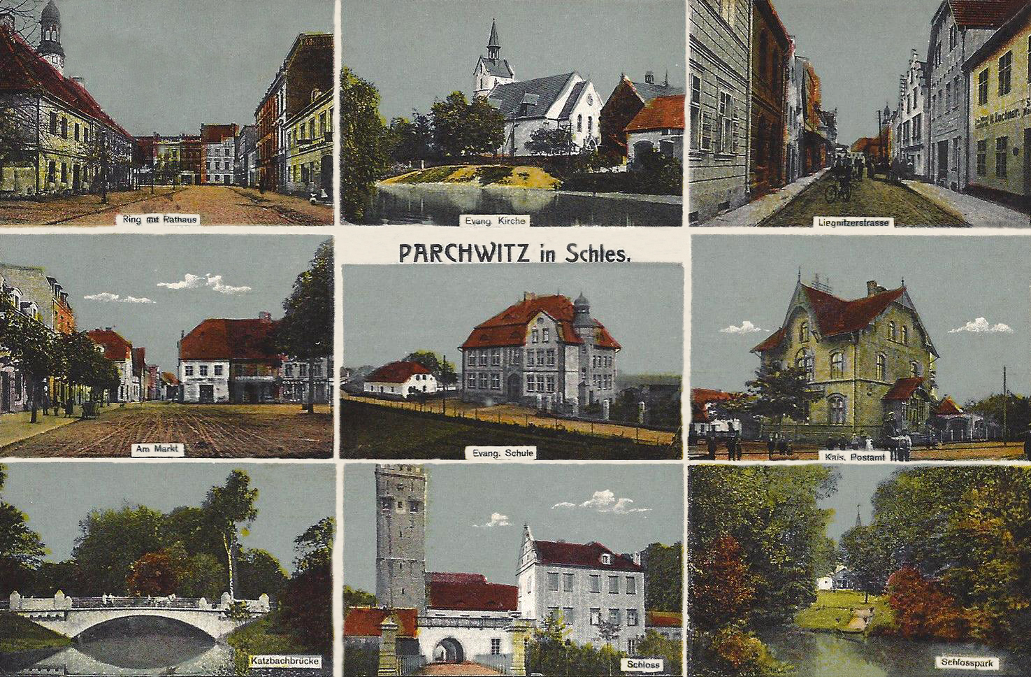Lata 1910-1919 , Prochowice na starej widokówce - u góry: 1) rynek z ratuszem, 2) kościół ewangelicki, 3) ul. Legnicka; w środku: 4) plac targowy, 5) szkoła ewangelicka, 6) urząd pocztowy; u dołu: 7) most na Kaczawie, 8) zamek, 9) park zamkowy. Kartka w pocztowym obiegu w roku 1919.Skomentuj zdjęcie |