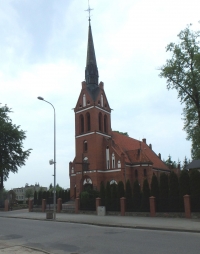 Jest to kościół neogotycki, murowany z cegły, jednonawowy, z wyodrębnionym wielobocznym prezbiterium i smukłą, kwadratową wieżą wysuniętą przed nawę. Po bokach prezbiterium usytuowano dwie zakrystie, natomiast po bokach wieży dwie kruchty – w efekcie do wnętrza prowadzą trzy profilowane portale. Wieżę zwieńczono ostrosłupową strzelistą iglicą nawiązującą do gotyckich sygnaturek, na szczycie której nad krzyżem osadzony został blaszany kur. Z blaszanego pokrycia dachu wieży zostały wyprowadzone narożne rzygacze. Elewacje budowli ozdobiono bogatym detalem, są tam profilowane okna z ceglanymi laskowaniami, okulusy w półszczytach nawy, pasy blend. Korpus zamknięto dachem dwuspadowym krytym dachówką. Wnętrze nawy nakryte zostało spłaszczonym sklepieniem kolebkowym, wspartym na osadzonych w murze belkach. W prezbiterium zastosowano sklepienie żebrowe. Prezbiterium oddzielone jest od nawy profilowanym łukiem tęczowym.