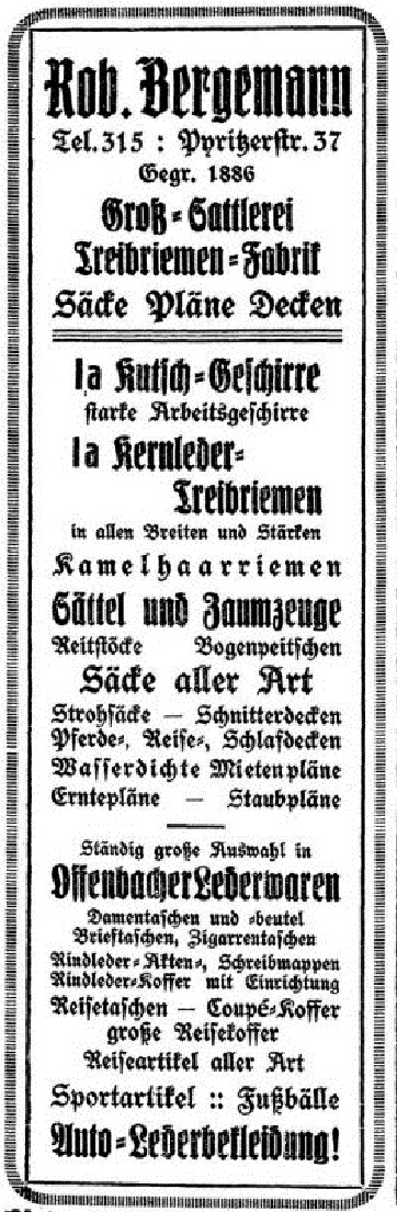 1926 , Robert Bergemann, tel. 315: ul. Pyrzycka 37. Rok założenia 1886. Wielka wytwórnia siodeł. Fabryka pasów napędowych. Sakwy, czapraki, derki. Uprzęże do powozów, mocne uprzęże robocze. Pasy napędowe z mocnej skóry o każdej szerokości i wytrzymałości. Pasy z wełny wielbłądziej. Siodła i uzdy. Szpicruty. Bicze z włosia. Sakwy wszelkiego rodzaju. Sakwy na siano [i tutaj wymienia różne rodzaje derek i czapraków]. Stale duży wybór wyrobów skórzanych z Offenbach [miasto w Niemczech, nad Menem]. Torebki i portmonetki damskie. Teczki na listy, woreczki na cygara. Aktówki ze skóry cielęcej. Kufry ze skóry cielęcej z wyposażeniem. Torby podróżne. Kufry do powozów. Wielkie kufry podróżne. Artykuły podróżne wszelkiego rodzaju. Artykuły sportowe: futbolówki. Odzież skórzana do jazdy samochodem. |