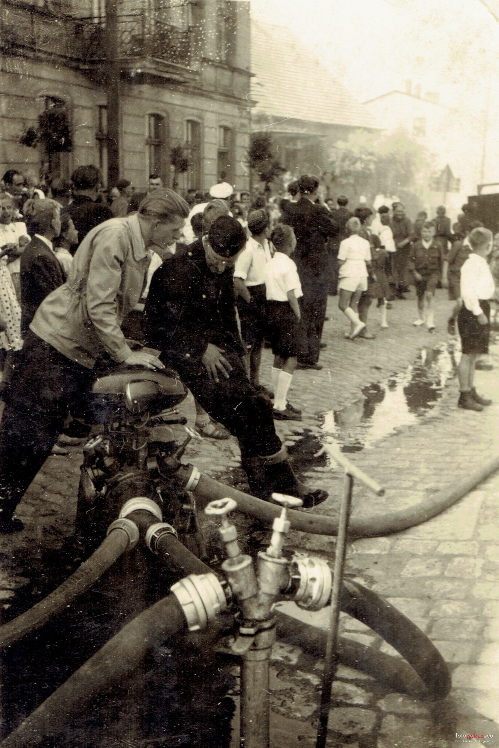 1953 , Plac Jagielloński - ćwiczenia straży pożarnej. Z lewej strony widoczny fragment kamienicy przy placu Jagiellońskim nr 6, w głębi widoczny zarys budynków przy ulicy Batorego nr 1 i nr 3.Skomentuj zdjęcie |
