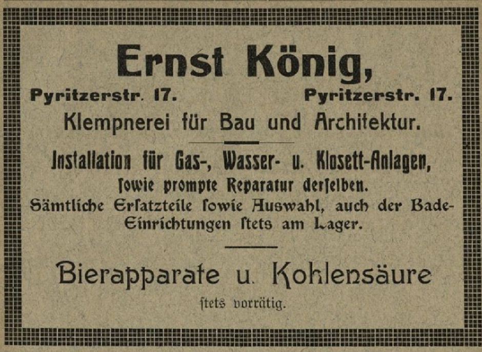 1910 , Ernst König, ul. Pyrzycka 17. Blacharstwo budowlane. Instalacja urządzeń gazowych, wodnych i klozetowych, a także natychmiastowa ich naprawa. Na składzie stale wszystkie części zamienne oraz wybór elementów do urządzania łazienek. Na składzie stale aparaty do warzenia piwa i dwutlenek węgla [do gazowania napojów]. Tłumaczenie dzięki uprzejmości Pani Agnieszki Gut.Skomentuj zdjęcie