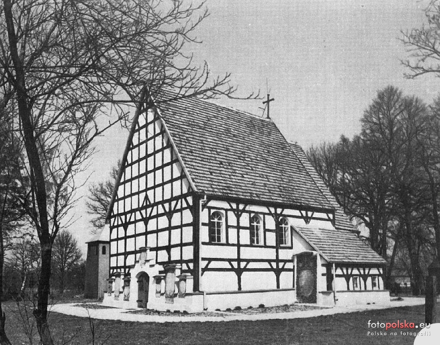 Budowa i wyposażenie. Kościół szachulcowy, jednonawowy konstrukcji słupowo – ramowej. Prezbiterium mniejsze od nawy, pięciobocznie zamknięte z boczną zakrystią. Z boku nawy kruchta z schodami na emporę. Dach dwukalenicowy, kryty dachówką. W fasadzie frontowej wmurowane epitafia. Wewnątrz jednokondygnacyjna empora obejmująca również prezbiterium. Strop belkowy. Ołtarz główny barokowy. Ambona osadzona na skręconym słupie z pelikanem karmiącym młode na baldachimie. Chrzcielnica barokowa. Drewniana dzwonnica. Zbudowana na planie kwadratu, zwieńczona dachem namiotowym.
