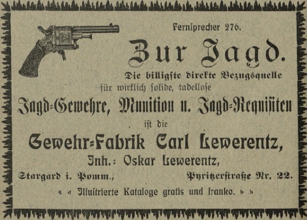 1910 , Na polowanie! Najtańszym źródłem bezpośredniego zakupu naprawdę solidnej i doskonałej broni na polowania, amunicji i innych sprzętów do polowania jest Fabryka Broni Carla Lewerentza. Właściciel: Oskar Lewerentz. Stargard na Pomorzu, ul. Pyrzycka 22. Ilustrowany katalog gratis i pokrycie kosztów dostawy. - tłumaczenie reklamy z 1910 r. dzięki uprzejmosci Pani Agnieszki Gut.Skomentuj zdjęcie |
