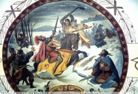 maj 2003 , Stary Wielisław; Kaplica - Mauzoleum w miejscu domniemanej śmierci księcia Jana ziębickiego. Fresk autorstwa Woerndlego z Kłodzka na sklepieniu kaplicy, przedstawiający chwilę śmierci księcia.Skomentuj zdjęcie |