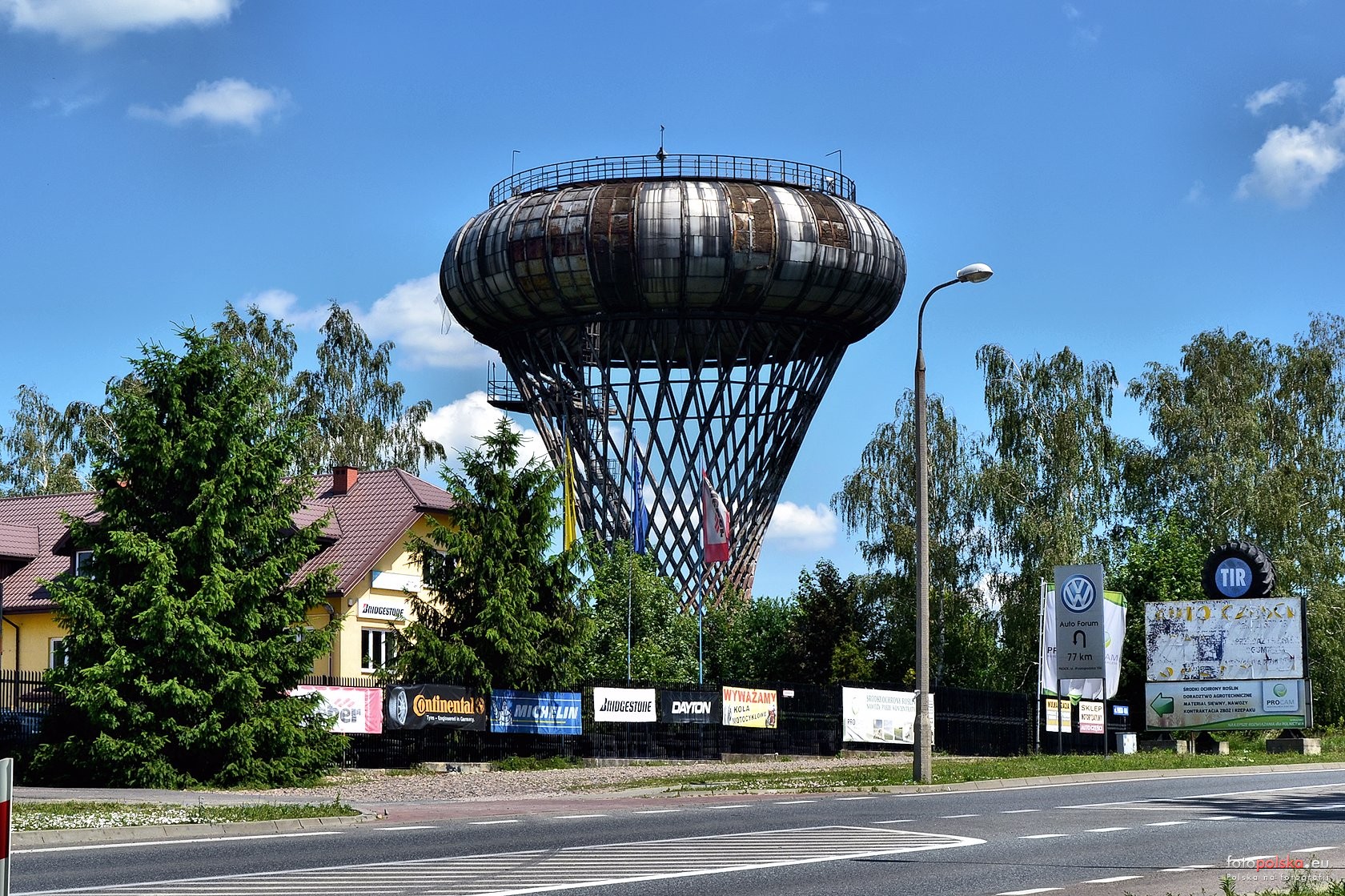 4 pobrania 777 odsłon 6 średnia ocen Poprzednie i następne zdjęcia maj Obiekty widoczne na zdjęciu Wieża ciśnień więcej zdjęć (7) Wieża ciśnień w Ciechanowie - wieżowy zbiornik wyrównawczy zaprojektowany przez warszawskiego architekta Jerzego Michała Bogusławskiego w 1972 r. przy współudziale konstruktora dr. Jerzego Wiblika, Stanisława Gajowniczka oraz Bohdana Szczeszeka. Technologię opracował inż. Stanisław Majkowski. Projekt opracowano w Biurze Projektowo- Badawczym Budownictwa Miastoprojekt Mazowsze w Warszawie przy współpracy Politechniki Warszawskiej. Zbiornik ma kształt torusa osadzonego na hiperboloidzie jednopowłokowej. Kubatura zbiornika wynosi 1560 m³, znajduje się na wieży o wysokości 22 m, o średnicy podstawy dolnej 11,25 m, górnej 17,70 m, średnica zwężenia ok. 7 m. Budowla ta formalnie jest wieżowym zbiornikiem wyrównawczym, nie zaś wieżą ciśnień, jednak pod taką obiegową nazwą funkcjonuje w Ciechanowie. Od lat osiemdziesiątych wieża stoi opuszczona. Plany urządzenia tu tarasu widokowego (wieża stoi na jednym z najwyżej położonych miejsc w mieście, 143 m n.p.m.) i restauracji wysokościowej nie powiodły się z powodu złego stanu technicznego. Na chwilę obecną obiekt nie jest użytkowany. Otrzymała w roku 1977 nagrodę Ministra Budownictwa i Przemysłu Materiałów Budowlanych a także gratulacje wojewody ciechanowskiego za wybitne osiągnięcie twórcze w dziedzinie architektury i budownictwa. ul. Płocka więcej zdjęć (16) |