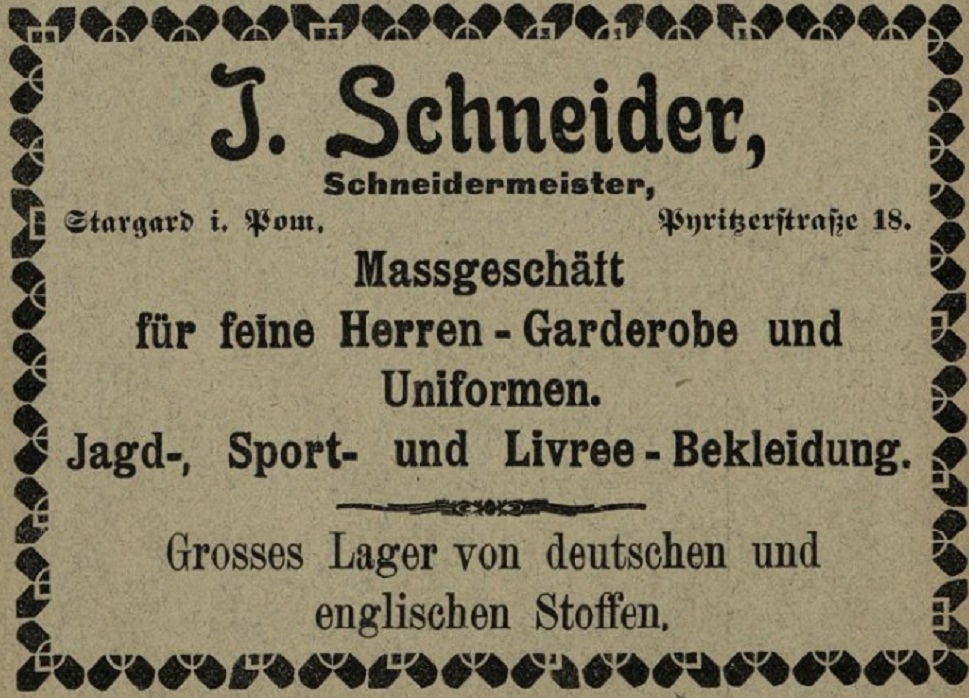 1910 , "J. Schneider, mistrz krawiecki, Stargard na Pomorzu, ul. Pyrzycka 18. Sklep z garderobą męską i uniformami. Ubrania na polowania, sportowe i liberie. Wielki skład niemieckich i angielskich materiałów." Tłumaczenie dzięki uprzejmości Pani Agnieszki Gut.Skomentuj zdjęcie |
