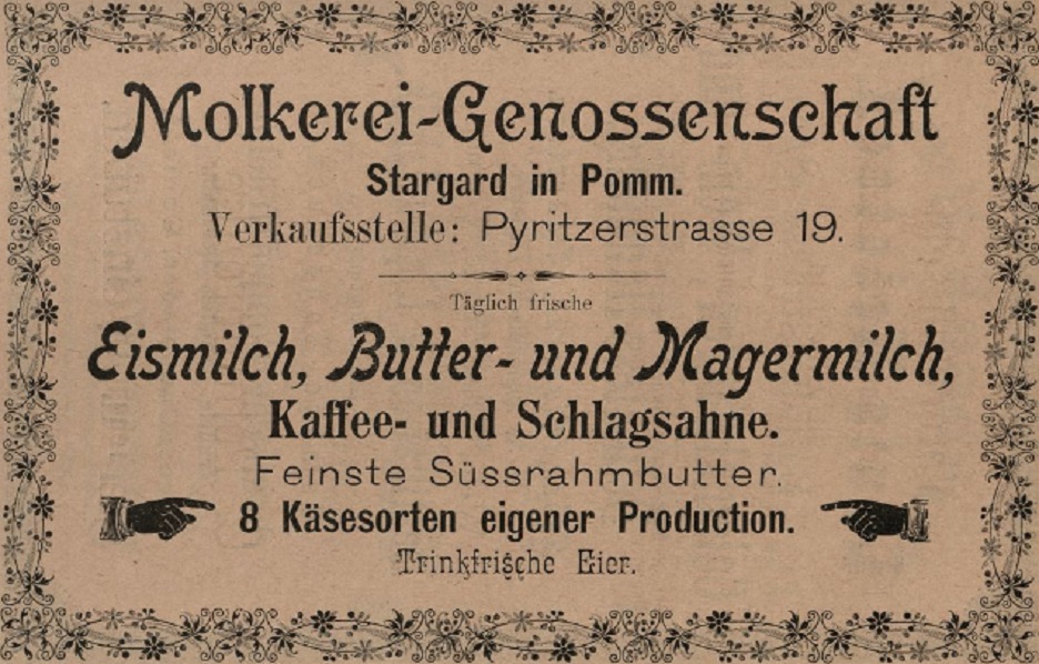 1900 , Spółdzielnia mleczarska. Stargard na Pomorzu. Punkt sprzedaży: ul. Pyrzycka 19. Codziennie świeże zimne mleko, maślanka, serwatka. Śmietanka do kawy i bita śmietana. Najlepsze Süßrahmbutter [to jakiś rodzaj masła, ale nie wiem, jaki]. 8 gatunków sera własnej produkcji. Jajka do picia na surowoSkomentuj zdjęcie |