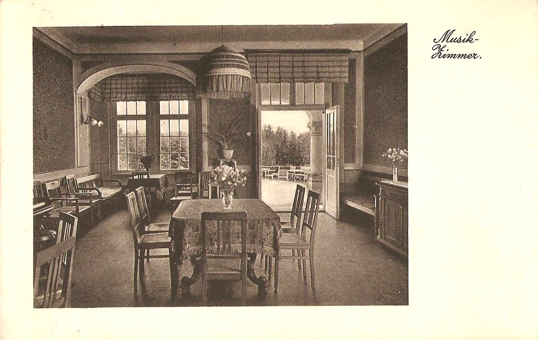 Lata 1930-1939 , Pokój muzyczny z wyjściem na taras w sanatorium "Birkenhof".Skomentuj zdjęcie |