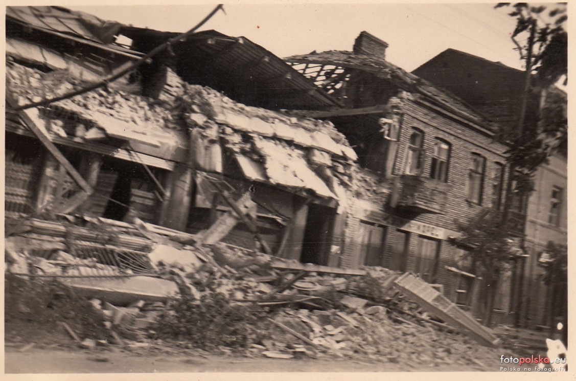 wrzesień 1939 , Zburzony podczas bombardowania dwupiętrowy dom przy ul. Marszałka Józefa Piłsudskiego, siedziba Komunalnej Kasy Oszczędności. Na parterze mieścił się m.in. sklep obuwniczy "Bata". Został odbudowany już w bardziej współczesnym stylu, bez ozdobnych gzymsów.Skomentuj zdjęcie