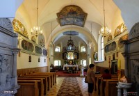 7 lipca 2016 , Wnętrze kościoła z XVII-wiecznym ołtarzem, w którego centrum pierwotnie znajdowała się scena ukrzyżowania, teraz mamy reprodukcję Czarnej Madonny. Po lewej u góry pozostałości po emporach, na które nie ma obecnie wejścia. Pod nimi, w miejscu obecnych ławek, znajdowały się stalle z wizerunkami świętych. Stalle zlikwidowano a malowidła trafiły do kruchty.Skomentuj zdjęcie