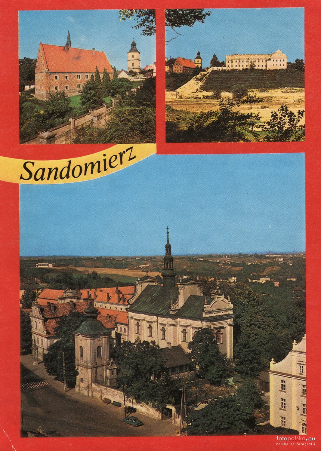 1984 , Sandomierz. Dom Długosza (XIV w.), w głębi dzwonnica katedry (XVIII w.) Collegium Gostomianum z 1 poł. XVII w. - najstarsze gimnazjum w Polsce. Fragment miasta z barokowym kościołem i klasztorem z XVII wieku.Skomentuj zdjęcie