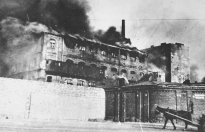 1943 , Płonąca fabryka podczas powstania w getcie warszawskim. Ulica Okopowa róg Glinianej.Skomentuj zdjęcie