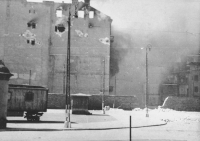 1943 , Płonące budynki getta podczas powstania. Widok z Nowiniarskiej w kierunku skrzyżowania Franciszkańskiej i Bonifraterskiej - ślepa ściana szczytowa to kamienica Franciszkańska 21.Skomentuj zdjęcie