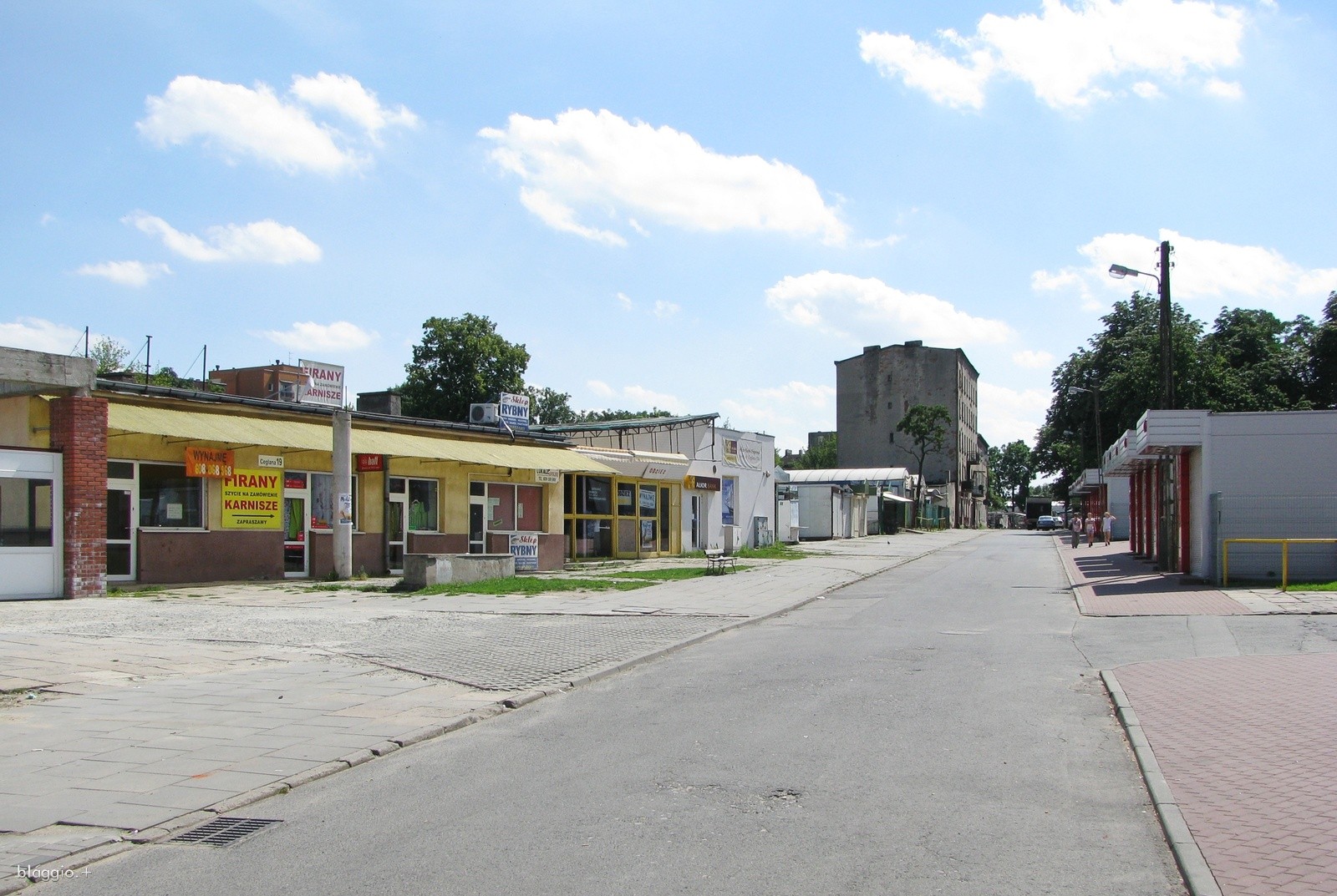 Po lewej dwuczęściowy prywatny pawilon handlowy, który wzniesiono na terenie należącym do pobliskiego nieczynnego szpitala, i który być może będzie rozebrany, jeśli uda się dokończyć budowaną obok halę targową.