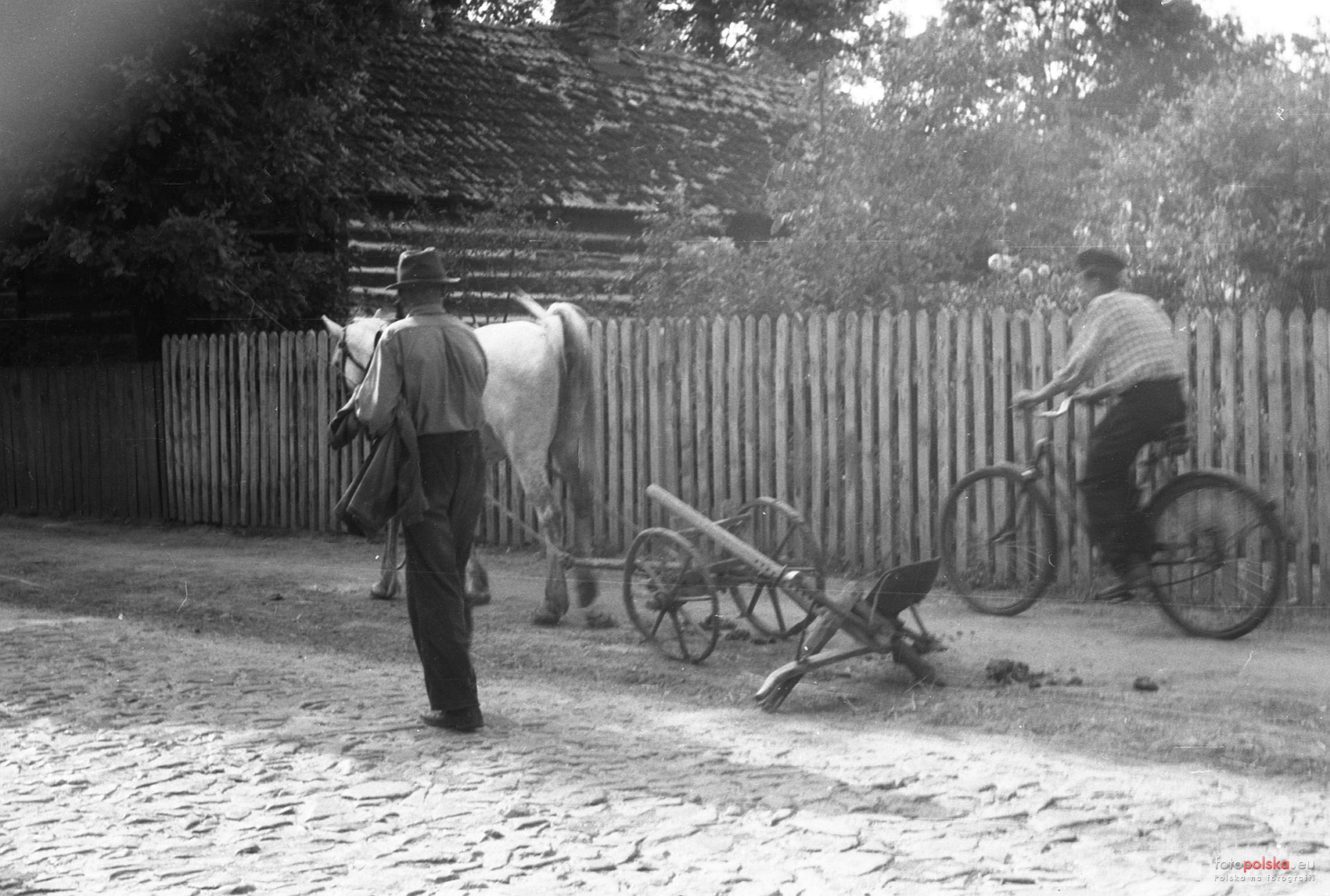 1959 , Koń zaprzężony w chomąto w drodze na pole z pługiem koleśnymSkomentuj zdjęcie |