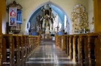 26 lipca 2016 , Wnętrze kościoła Narodzenia NMP w kierunku ołtarza (przez kratę). Świątynia murowana powstała w tym miejscu w XV w. Jednak to co dane jest nam oglądać pochodzi z 1658 r., kiedy odbudowano kościół po pożarze.Skomentuj zdjęcie |