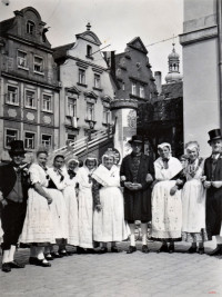 1935 , Grupa folklorystyczne podczas obchodów Tygodnia Karkonoskiego na rynku w dawnym Hirschbergu (ob. Jelenia Góra).Skomentuj zdjęcie
